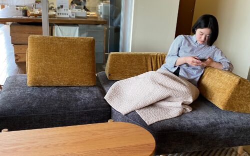 ソファに座ってみると私の方まで背クッションがあるので包み込まれるソファです。