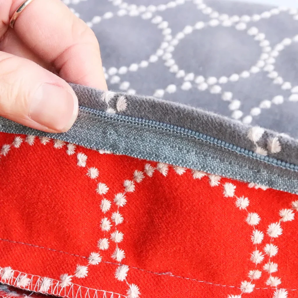 「刺繍糸:ホワイト」のグレーは、裏面はオレンジの生地。