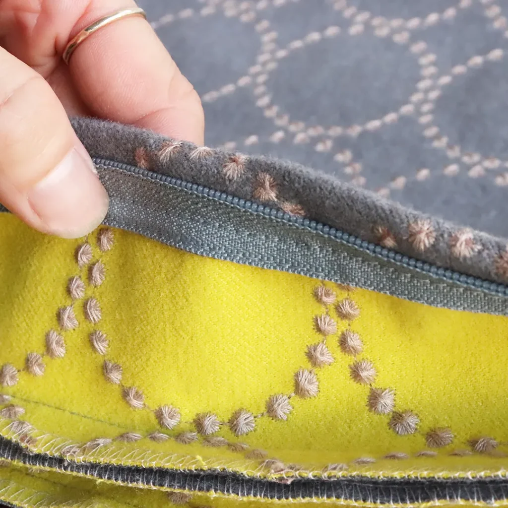 「刺繍糸:ピンクベージュ」のグレーは、裏面はイエローの生地。