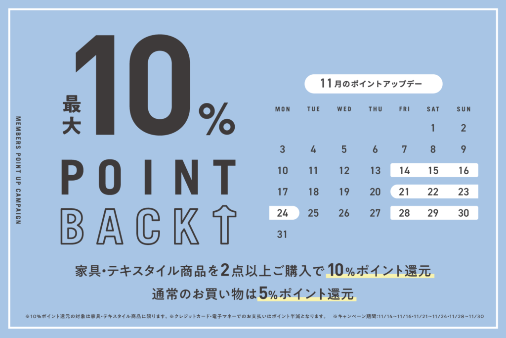 家具・テキスタイルをご検討中の方におすすめの、お得なポイント還元キャンペーンを開催します。